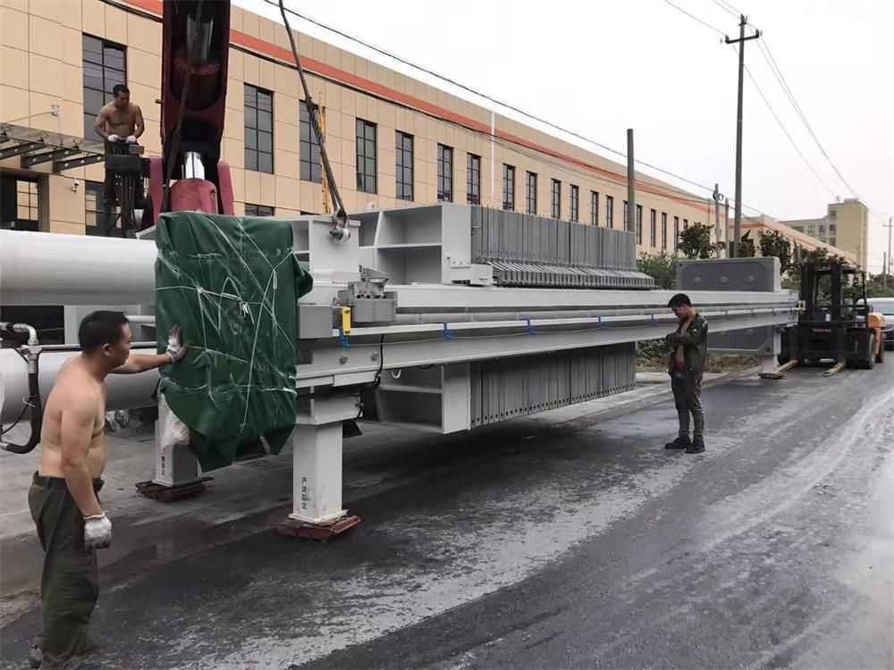 液壓廂式壓濾機由交替排列的濾板和濾框構成一組濾室。濾板的表面有溝槽,其凸出部位用以支撐濾布。濾框和濾板的邊角上有通孔,組裝后構成完整的通道,能通入懸浮液、洗滌水和引出濾液。板、框兩側各有把手支托在橫梁上,由壓緊裝置壓緊板、框。板、框之間的濾布起密封墊片的作用。由供料泵將懸浮液壓入濾室 在濾布上形成濾渣,直至充滿濾室。濾液穿過濾布并沿濾板溝槽流至板框邊角通道,集中排出。過濾完畢,可通入清洗滌水洗滌濾渣。